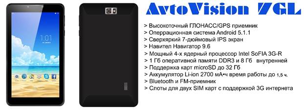 | AvtoVision 7GL | 6990 | Pour déterminer l'emplacement, l'appareil se concentre sur un signal GLONASS et GPS conjoint | |