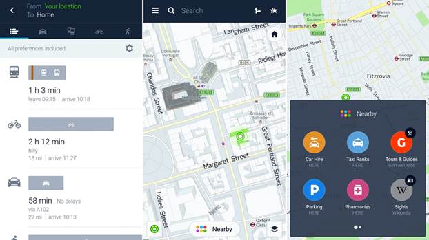 Il est utilisé non seulement par les conducteurs, mais aussi par les piétons et les athlètes. Les cartes montreront ce qui est à côté de vous, quels cafés ou restaurants. Il n'est pas toujours sûr d'être distrait par l'écran du smartphone sur la route, de sorte que l'application prend en charge le guidage vocal «de virage en virage». Certaines cartes affichent même des modèles 3D. Il existe une fonction qui vous permet de partager votre propre position avec des amis.