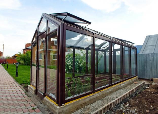 - Verre. Matériau populaire pour la construction de serres. Il présente les avantages suivants: il transmet la lumière du soleil, une bonne isolation thermique, tolère les changements de température, une longue durée de vie, une belle apparence. Avec les avantages, il y a de nombreux inconvénients: lourds, à cause desquels vous devez installer un cadre puissant, fragile aux dommages mécaniques, longue installation.