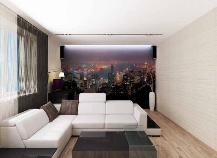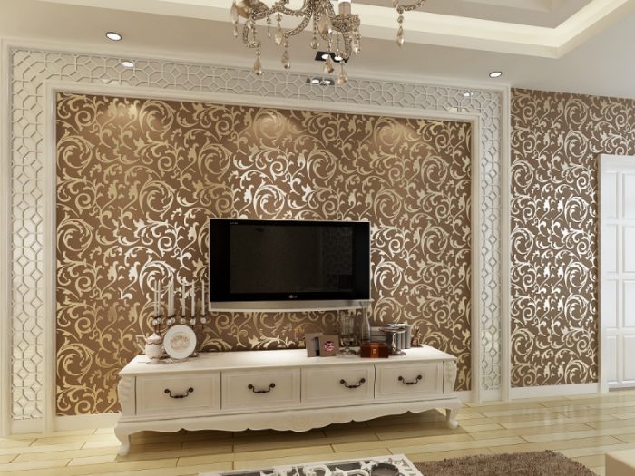 La finition peut être effectuée avec tous les revêtements. Le meilleur papier peint pour le salon est considéré comme non tissé, liquide ou textile. Ils sont beaux, pratiques.