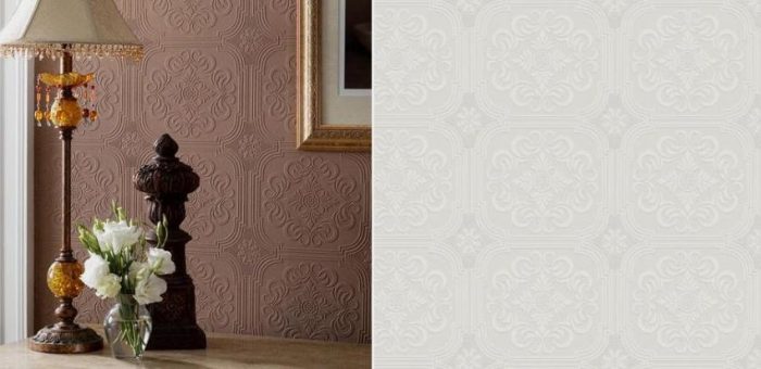 Le relief du papier peint lisse les parois inégales, cache les défauts. Il n'est pas nécessaire de mastic. Le relief est créé sur du papier, du vinyle et des revêtements non tissés. Ils obtiennent des images 3D, imitent les matériaux de décoration (maçonnerie, bois). L'inconvénient est que la poussière s'accumule sur la surface convexe.