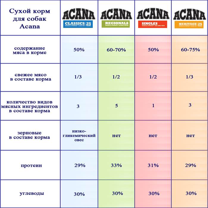 | Acana | 1570 roubles / 2 kg | La gamme contient de la nutrition pour les personnes âgées, les bébés, les chiens passifs et hyperactifs, les petites et grandes races. |