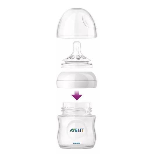 Une bouteille en verre de 250 ml est conçue pour les bébés dès la naissance. Le mamelon en silicone de forme classique a une faible résistance à l'écoulement. Facile à nettoyer, désinfecté.
