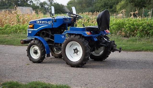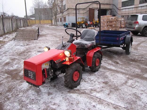 La puissance du moteur est de 12 chevaux. Tous les éléments auxiliaires comme une tondeuse ou une charrue peuvent être attachés au tracteur.