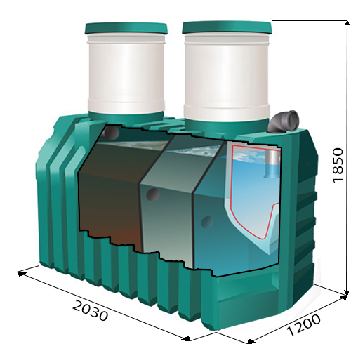 Un modèle abordable et polyvalent conçu pour une petite famille de 3 personnes. Il peut être installé dans tout type de sol. Equipé d'un puisard haute résistance. Le réservoir est conçu pour 1,55 mètre cube de masse de déchets, divisé en plusieurs sections. Le nettoyage comprend plusieurs étapes, notamment aérobie. Pendant 1 jour, il peut transformer 200 litres d'effluent en eau. Les boues dans les réservoirs s'accumulent lentement. Les services d'une pompe d'aspiration devront être utilisés environ 2 fois sur 1 à 3 ans.