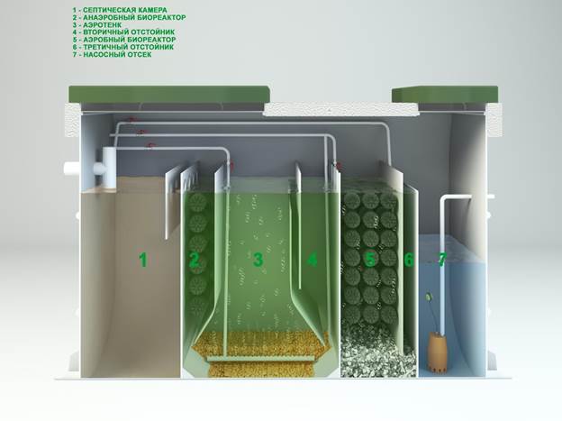 - Nettoyage biologique en profondeur. Composé de plusieurs sections-puits. Chez eux, l'effluent subit une décomposition progressive. Les processus sont effectués mécaniquement et chimiquement. Les matières organiques résiduelles peuvent être rejetées dans le sol ou les étangs.