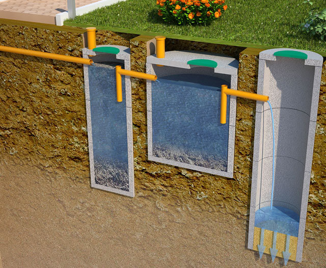 Les eaux usées s'écoulent initialement par des tuyaux d'égout dans la fosse septique pour un post-traitement dans le sol. Le processus de purification se déroule par étapes.