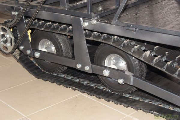 La suspension sur les rouleaux ressemble à un réservoir par le principe de fonctionnement: les roues en fer sont responsables de la rotation, dont les pointes tombent dans la rainure de la piste. Il s'agit d'une option universelle: vous pouvez la monter sur de l'herbe haute, un champ ou surmonter la neige peu profonde. L'inconvénient d'une telle suspension est qu'elle se bouche rapidement lorsque la saleté pénètre. Doit nettoyer régulièrement les rouleaux.