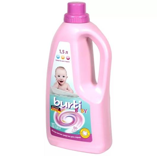 BurtiBabyLiquid est un détergent hypoallergénique pour laver les vêtements des enfants, ne contient pas de phosphates.