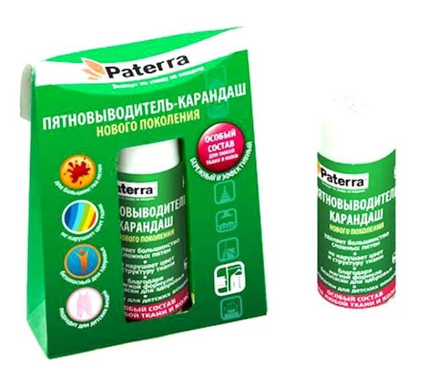 "PATERRA" - utilisé sur des tissus de différents types. Il peut être utilisé sur des produits en cuir. Composition de protéines naturelles - aide à éliminer les taches fraîches et anciennes sans laisser de trace.
