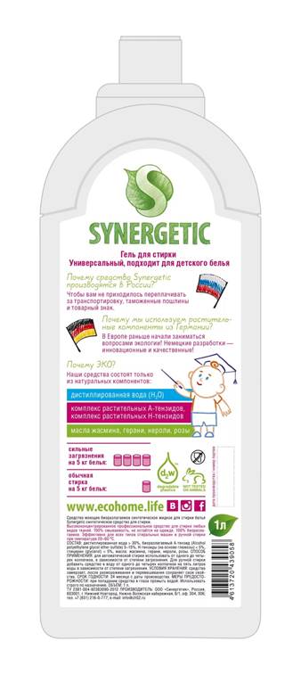 «Synergetic» sans composants phosphatés, hypoallergénique, est l'une des meilleures solutions concentrées pour nettoyer la saleté des vêtements pour enfants.