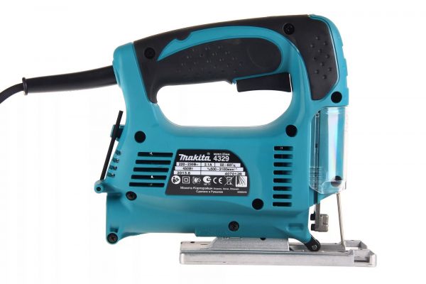 Si vous prévoyez d'acheter un outil fiable, achetez un Makita 4329X1, d'une valeur de 4 500 p. Sa puissance de 450 watts est suffisante pour faire face aux problèmes de finition. L'appareil prend en charge le réglage de la vitesse de rotation de la lime de scie et résiste également facilement à la charge même lors du sciage d'un arbre de 65 mm d'épaisseur. La conception de l'outil implique d'incliner la semelle à 45 degrés, ce qui rendra les coupes difficiles. Le poids est de 1,9 kg, la possibilité d'ajuster la course du pendule en 4 étapes, la connexion d'un aspirateur et d'une semelle moulée, c'est ce que vous obtenez pour l'argent.