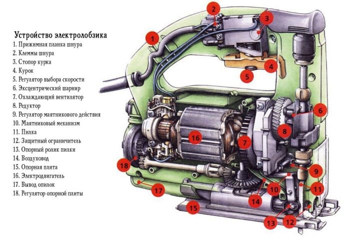Un élément important dans la construction d'une scie sauteuse électrique est le moteur. Il a la puissance dont dépend l'épaisseur de la pièce à usiner lors du traitement. Plus la puissance est faible, moins la force avec laquelle la lime se déplace le long de la pièce.