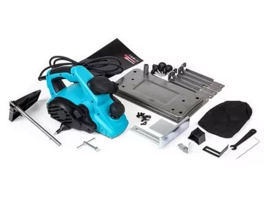 Rabot électrique très puissant. Equipé d'une descente en douceur et d'un système de support de régime. De plus, la fonction de limitation de courant fonctionne, ainsi qu'un système de protection contre les surcharges. La profondeur de combustion est de 4 millimètres et la puissance du moteur est de 850 watts. Il est pratique d'utiliser à la fois la main gauche et la main droite. Vous pouvez également couper des quartiers biseautés et effectuer des tâches de biais.