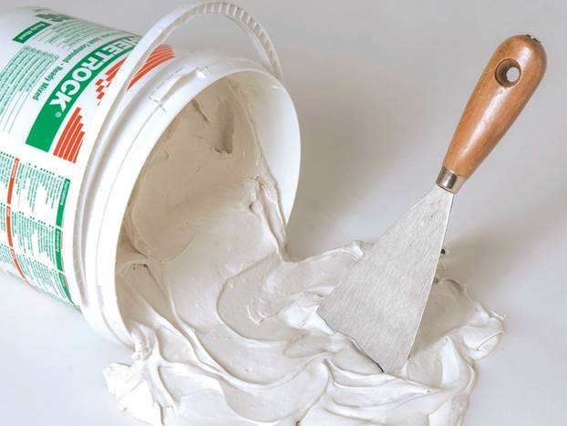 Ce sont des mélanges plus polyvalents et pratiques utilisés pour le travail interne. C'est un bon mastic de plaque de plâtre, qui convient également aux surfaces en ciment et en béton. Si vous faites attention au nom, il deviendra clair que le composant principal du mélange est le gypse. De plus, des agents plastifiants minéraux et des additifs polymères sont ajoutés, ce qui est nécessaire pour améliorer les caractéristiques de la base durcie.