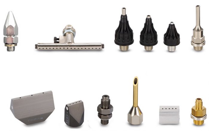 Différentes buses de l'ensemble élargissent la fonctionnalité de l'outil dans divers domaines, peuvent changer le diamètre du jet de colle fourni