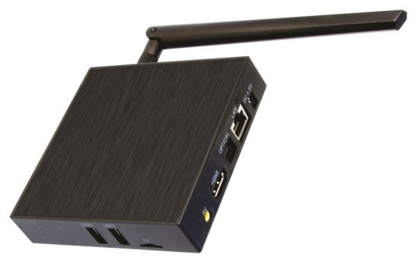Une petite boîte avec le contenu d'un vrai ordinateur. L'appareil fonctionne sous Windows 10. La fonctionnalité de l'ordinateur de bureau vous permet de lire des vidéos, d'écouter de la musique et d'effectuer un certain nombre d'autres opérations. L'appareil est connecté au téléviseur à l'aide d'un câble HDMI. Il y a des emplacements pour les cartes mémoire.